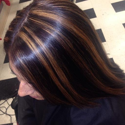 Picture Of Straight Black Hair With Rich Caramel Highlights